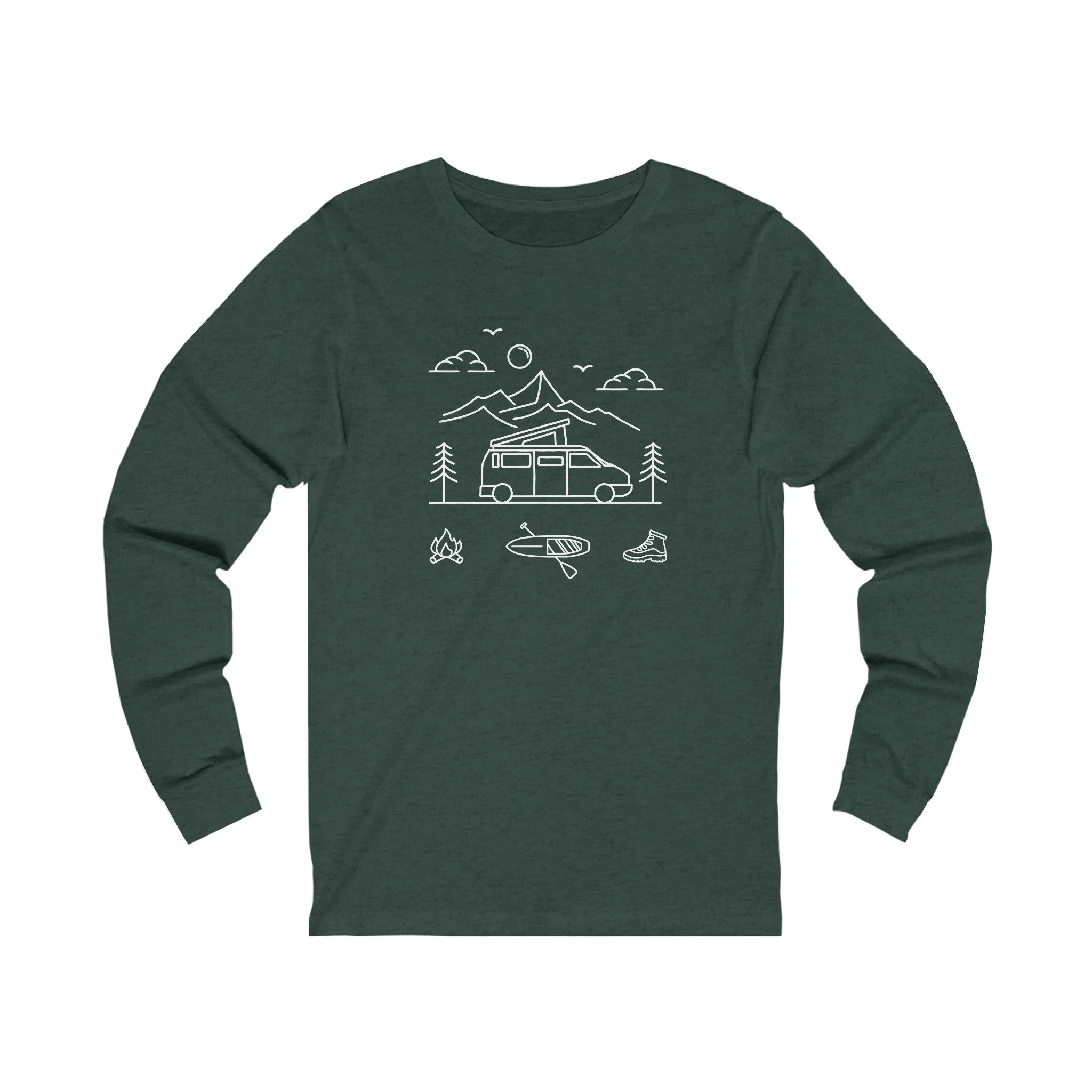 Make the holidays Super Cool with the long-sleeve version of our camper van t-shirt. Simple line art brings together all the elements of a perfect camper van outing: mountains, hiking, paddle boarding and, of course, a campfire.