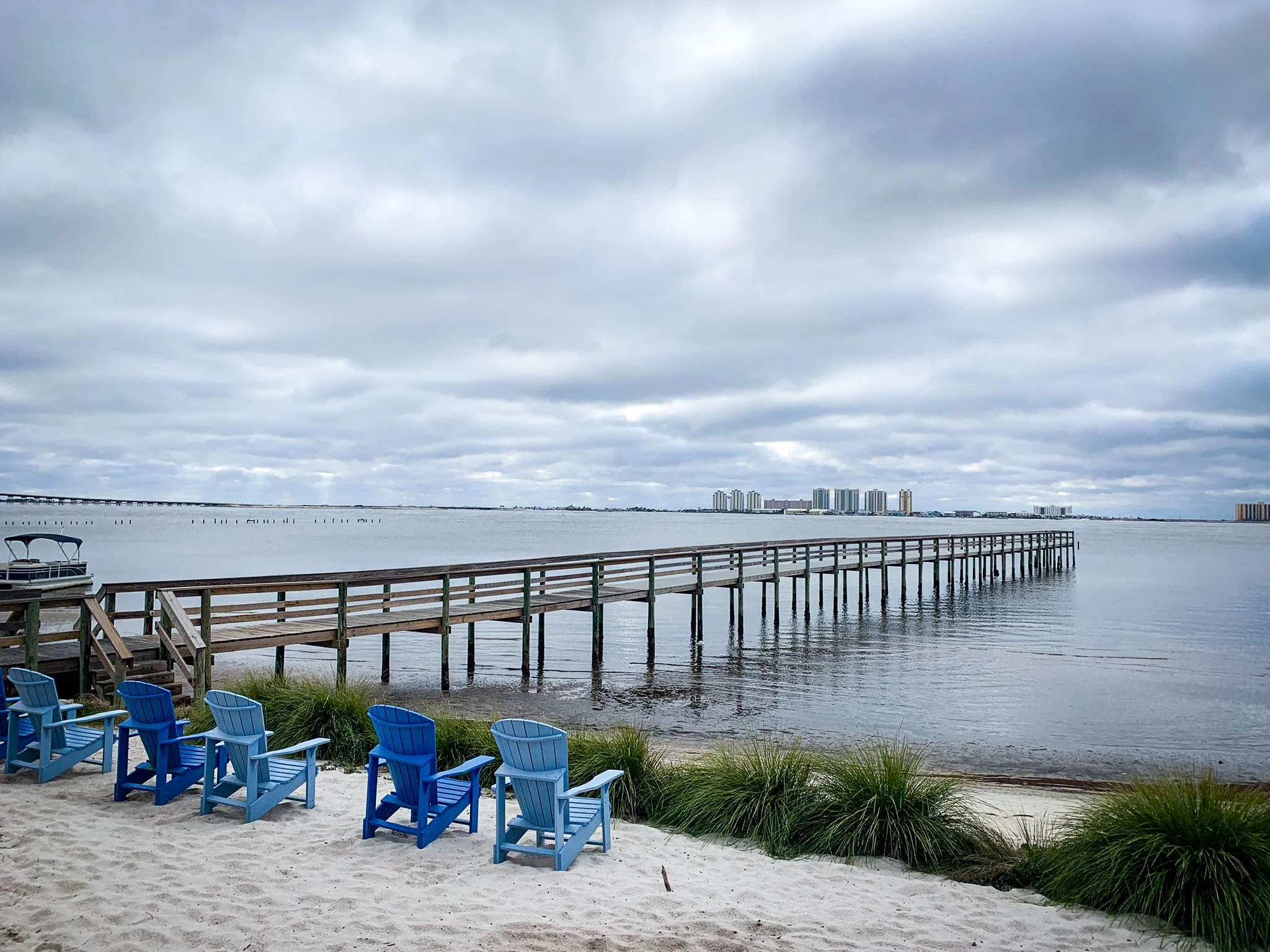 A row of Adirondack chairs overlooks the fishing pier and Santa Rosa Sound.