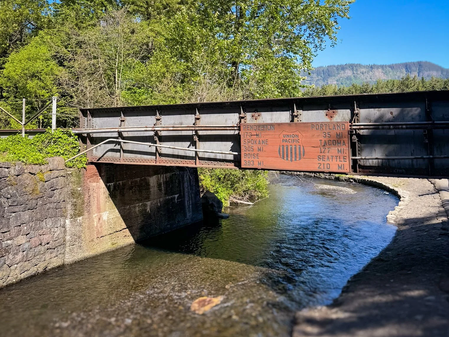 An old railroad bridge crosses over Multnomah Creek, which runs alongside the walkway from the I-84 parking lot to Multnomah Falls Lodge.