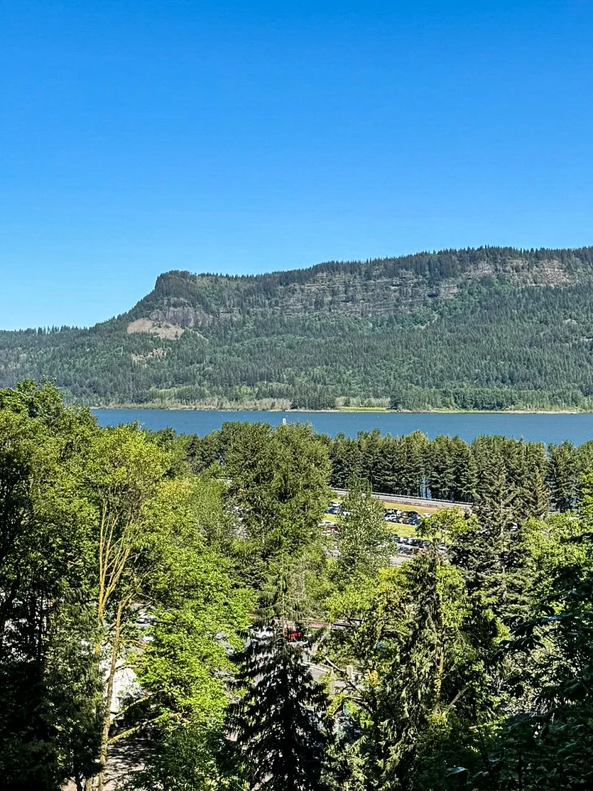 Once you cross Benson Bridge and head uphill on the Multnomah Falls trail, you can enjoy views to the north of the Columbia River and Archer Mountain in Washington. You can also see the parking lot between eastbound and westbound I-84.