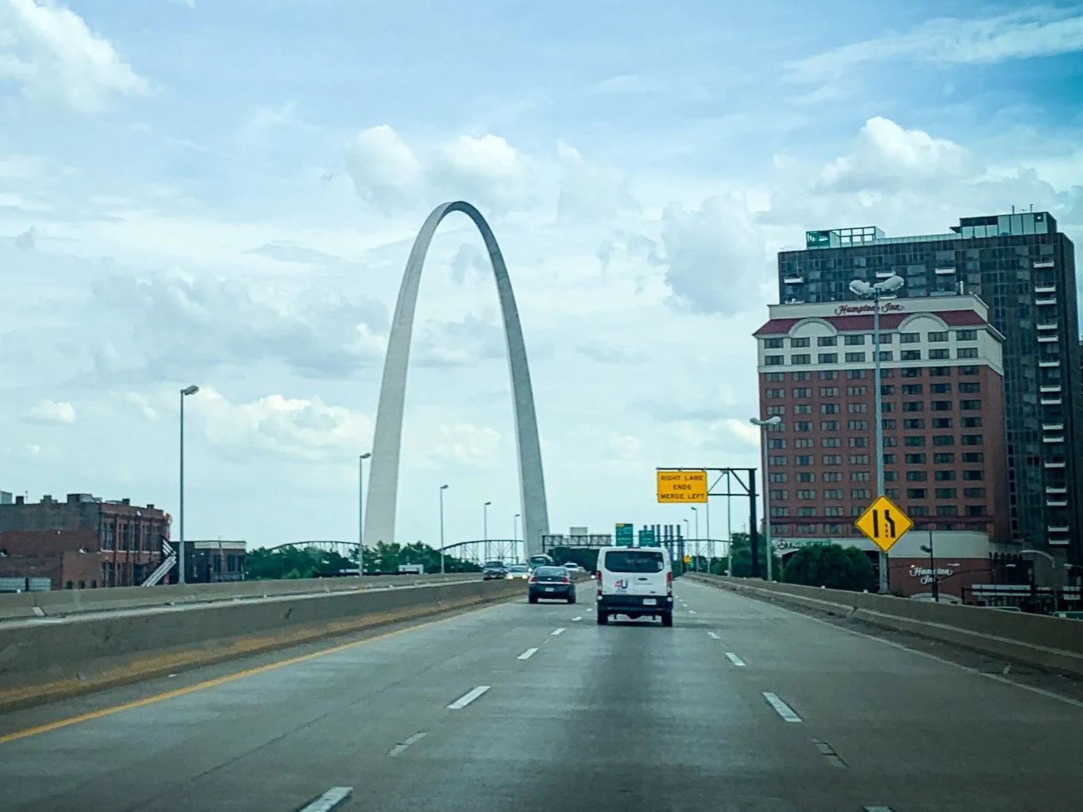 Driving at a steady speed on a non-congested freeway can help your camper van use less gas. This stretch of I-70 takes you past the Gateway Arch National Park in St. Louis.